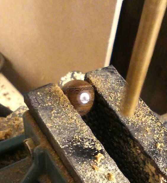 Podría haber perforado agujeros de 5 mm en cada uno (excepto el más grande) bola mientras que en el torno, pero esto habría dado lugar a humo que acabo de ir hacia arriba, quería más forma, así que las bolas a cabo en un ángulo y perforar los agujeros en el taladro de banco.