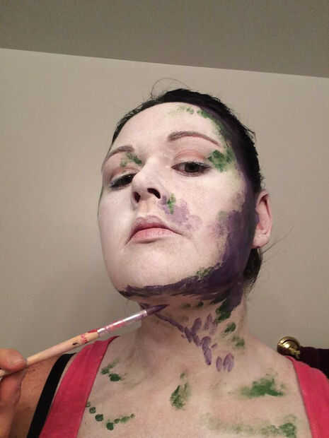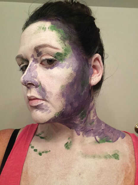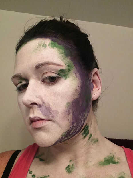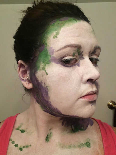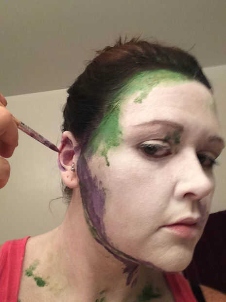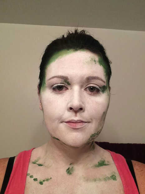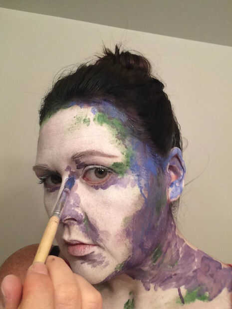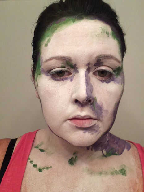 Utilicé la pintura de cara verde primero con mi dedo y ponerlo donde vi algo de sombra. Elegí el verde porque era el color más oscuro con que se estaría trabajando, y pensé demuestran para arriba muy bien en los otros colores. Para este paso, usted querrá parado en una luz que se proyecta algo de sombra, así que nada demasiado brillante y directa. Esta es mi manera de "hacer trampa" - básicamente sólo tienes que seguir las sombras! También eventualmente dará la pintura de perspectiva.