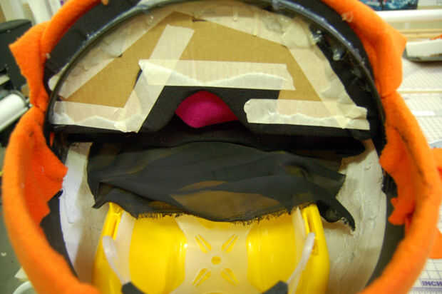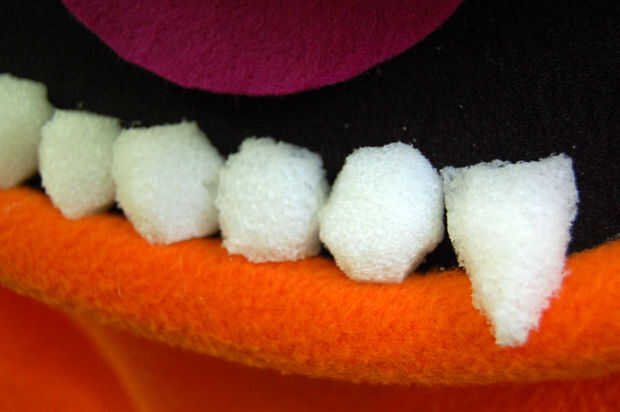 La boca se forma con dos piezas de cartón, forrada en fieltro negro. La pieza superior se monta en la cúpula de papel maché, y la pieza inferior se une a la anilla de la boca. La parte inferior tiene un espacio para la nariz, que hábilmente se cubre por la lengua de fieltro rosa. Los dientes son mano tallada en espuma de célula cerrada, duro.