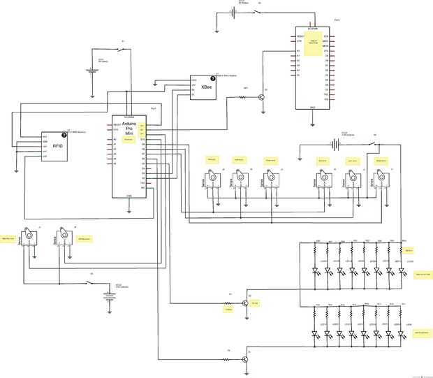 Hay algunas notas en el diagrama pero es bastante sencillo. Cuando las piezas fueron compradas para el juego el lector ID12 sólo estaba disponible en una versión de 5V, que es alimentada por el Arduino. Puesto que los servos son accionados por una batería de 6V, era más fácil simplemente utilizar una batería de 9V para los paquetes de Arduinos y 6V para los servos porque necesita aislar la fuente de alimentación para el Arduino debido al ruido eléctrico generado por los servos.