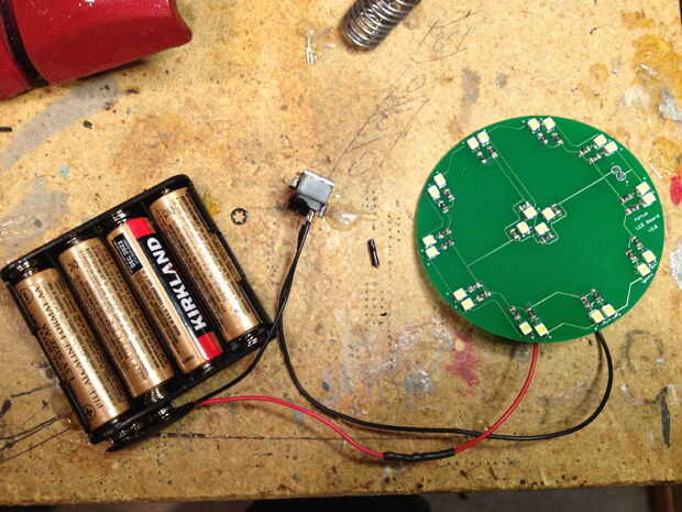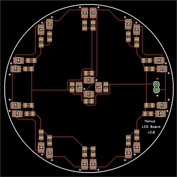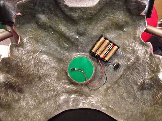 La luz del pecho me creado un simple PCB en EAGLE y soldado en los LEDs y resistencias de montaje superficial. El PCB terminado fue cableado y montado detrás de la pechera translúcido. Un sistema de iluminación similar podría hacerse con perfboard estándar LEDs y resistencias. Con las manos suerte hacia fuera y no tenía que construir el sistema de iluminación de cero como Greg tenía ya un repulsor luz y sistema de sonido que fue donado por un amigo.