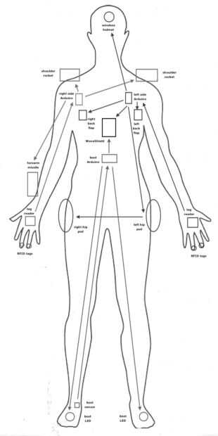 La mano izquierda tiene dos etiquetas RFID que desencadenar secuencias programadas de casco, vainas de cadera y posterior de las aletas. Las etiquetas RFID de mano derecha desencadenan secuencias programadas para los cohetes de misiles y hombro de antebrazo. Las botas tienen un sensor infrarrojo que activa el arranque luces y efectos de sonido como el arranque es levantado del suelo.