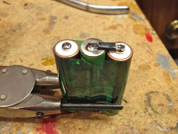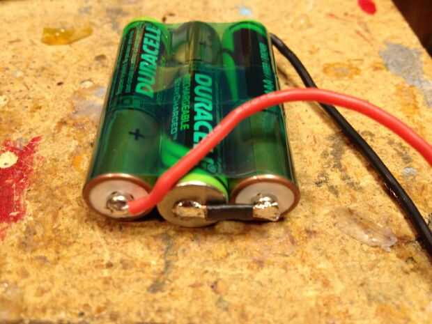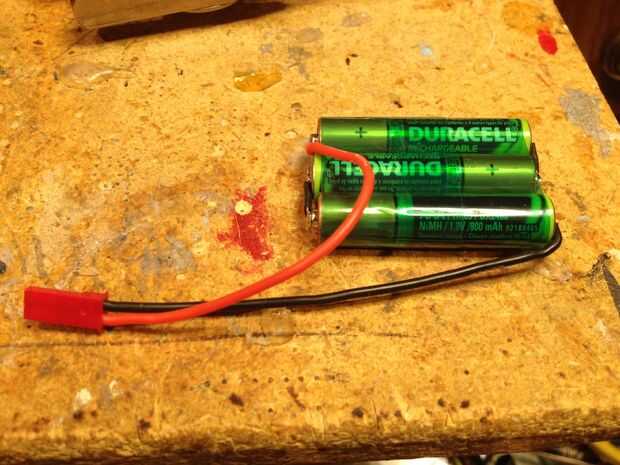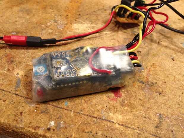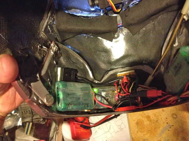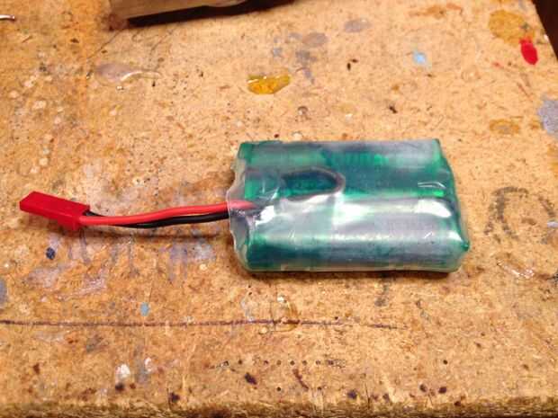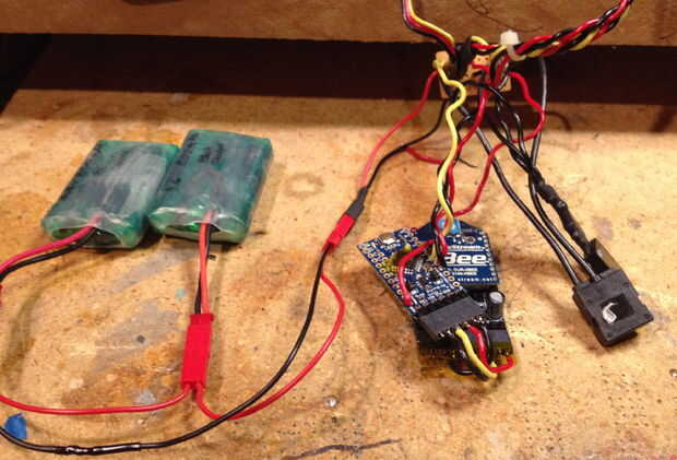 En el lado de la electrónica, un paquete de baterías de split fue construido usando seis células de NiMH AAA para un total de 7.4V para alimentar los servos digitales de alto voltaje. Originalmente habíamos planeado sobre el uso de paquetes de LiPo pero sentía que las células de NiMH sería mucho más seguras y menos problemas en cuanto a la batería de gestión-ver la sección de preguntas frecuentes para obtener más información. Las dos baterías fueron cableadas hasta un Arduino ProMini (3.3V versión) junto con un radio XBee. Poder de la ProMini fue caminado hasta 5V usando un convertidor DC/DC de Pololu. La electrónica se cubrieron con termocontraíbles para protección. Utilizo un Hitec X 1 cargador de MF para el casco de carga de baterías.