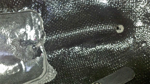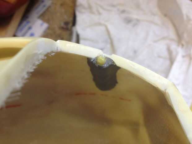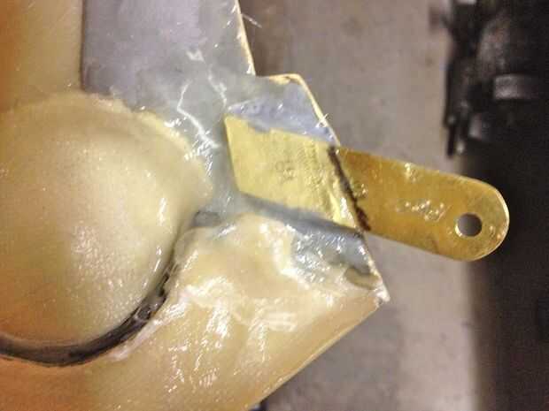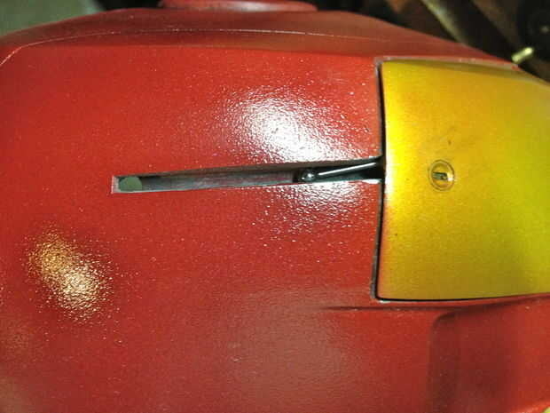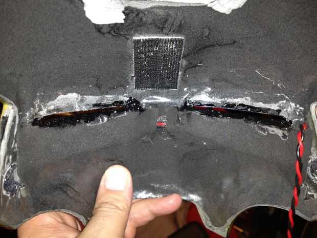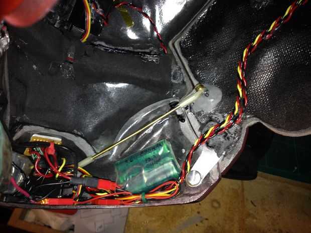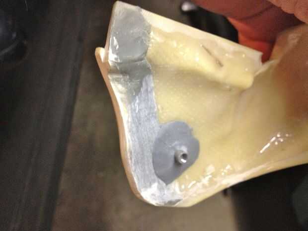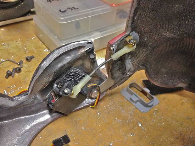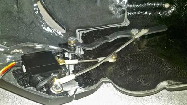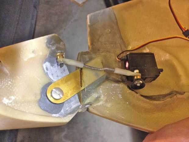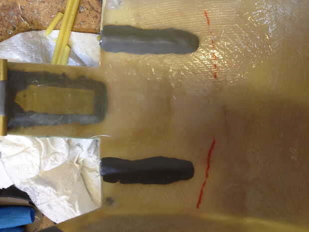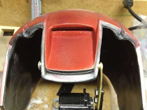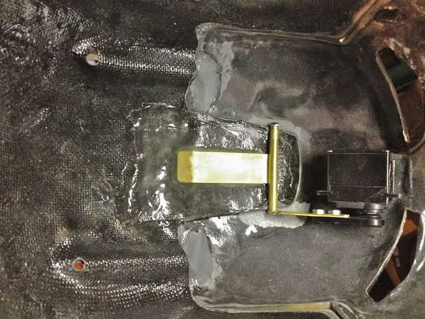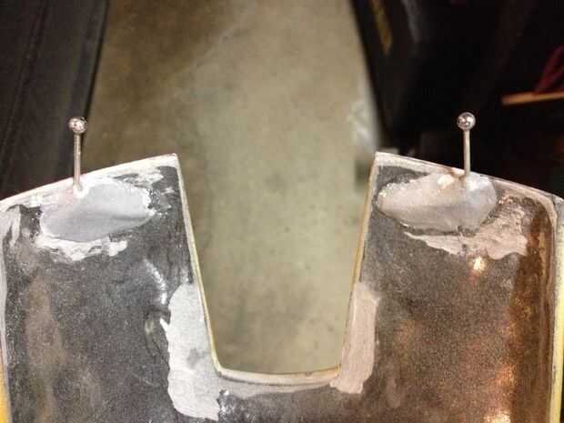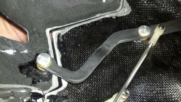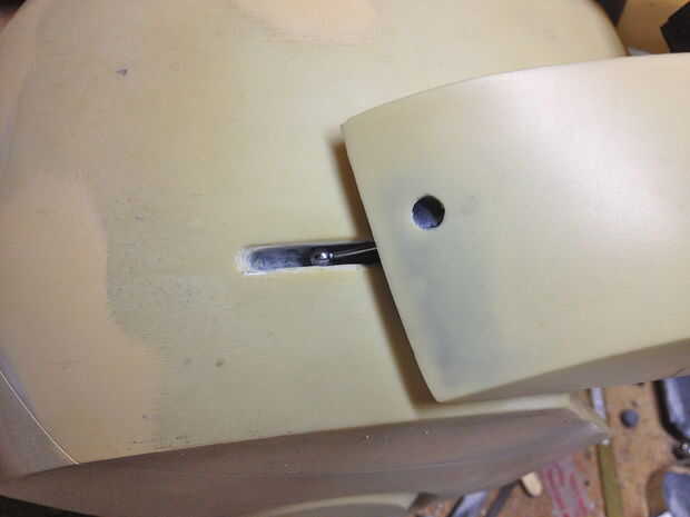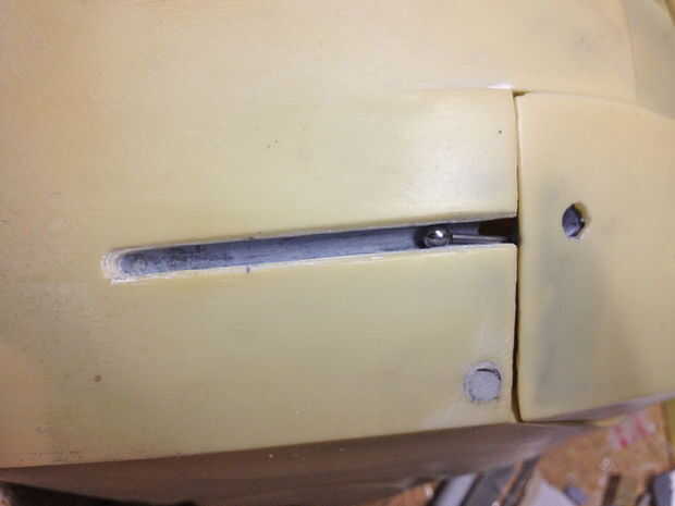 A continuación mezclan algunos masilla de epoxy del ProPoxy 20 y había construido sobre las varillas de plástico. Una vez que la masilla de epoxy curado puso algún paño ligero de fibra de vidrio en la parte superior con alguna resina de epoxi. La tela de fibra de vidrio reforzará la masilla epoxi y asegúrese de que no debond desde la parte inferior del casco. Luego quitar las varillas de plástico y corte las ranuras en la parte superior del casco, para que las guías de acoplamiento de bola podrían deslizar en las ranuras. Las ranuras en la parte superior del casco deben ser más angostas que las ranuras moldeadas para que el enlace de bola no sale como las diapositivas de la placa frontal hacia atrás.
