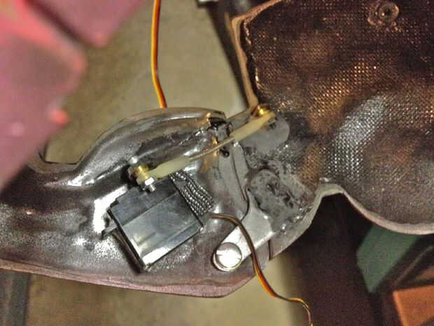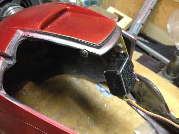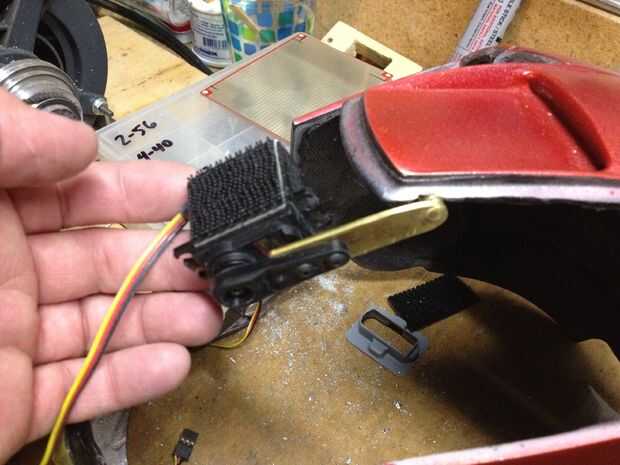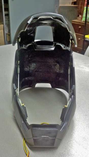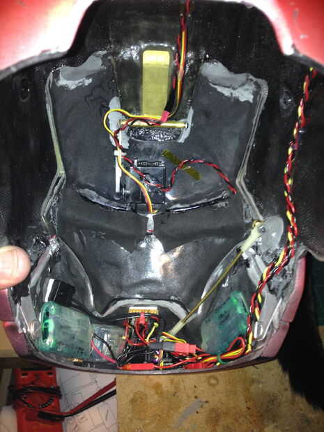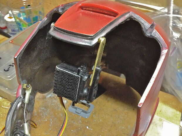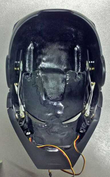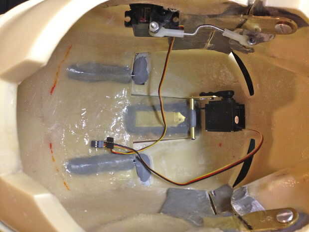 El mecanismo de servo fue cambiado para que un mini servo abriría la placa frontal mientras otro abría la barbilla, que abrirían camino que la sincronización podría ser cambiada por lo que la placa frontal abriría primero y luego la barbilla. Al cerrar el casco la barbilla cerraría primero, luego la placa frontal. El servo de la placa frontal tiene un brazo de latón que es plata soldada a una bisagra que es fiberglassed en la sección central superior del casco. La placa que se suelda al tubo de la bisagra se extiende hacia atrás maneras para apoyar la sección del casco, ya que de lo contrario sería demasiado flexy para funcionar correctamente. Tanto de los servos se unen al casco mediante Velcro de alta resistencia.