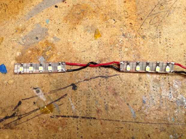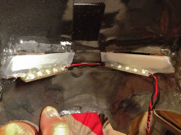 Un sellado pulsador interruptor fue agregado junto con un transistor para encender las luces de LED para los ojos. Los ojos fueron construidos usando LEDs blancos de SMT (cualquier pequeño LED funcionará) con material de la jarra de leche para las lentes. Las lentes tienen una hendidura en la parte superior para que el usuario puede ver hacia fuera y hoja de la espuma negro fue utilizada para bloquear la luz en el interior del casco.