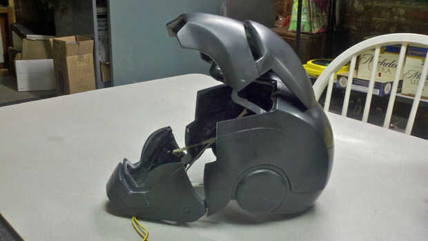 Aquí está el video de lo animatronics de casco revisado. Nota la eliminación de las armas necesarias para levantar la placa frontal-