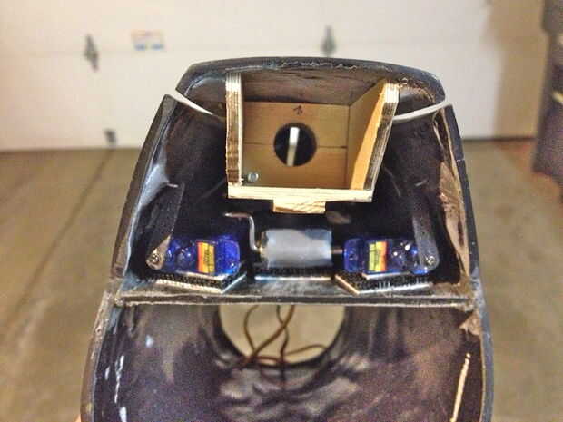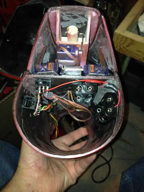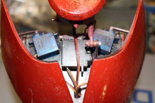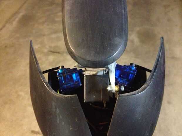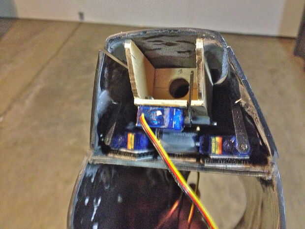 La carcasa del misil fue construida usando la hoja de madera contrachapada de abedul fino. Para hacer la vivienda mueva hacia arriba y atrás un pequeño paralelogramo acoplamiento fue fabricado y atado al micro servo que plantea la vivienda. El servo se une a la placa base del guante con Velcro de alta resistencia. El delantero de la bisagra utiliza un enlace de 4-40 giratorio unido a la madera contrachapada cubierta-se perfora un pequeño agujero en la carcasa del misil y la varilla giratoria se ajustaron en su lugar. El posterior enlace utiliza alambre de la música que gira en tubos de latón ajustaron el servo y la cubierta de madera contrachapada. La cara de la carcasa del misil se construyó utilizando Apoxie Sculpt.
