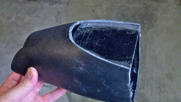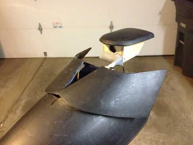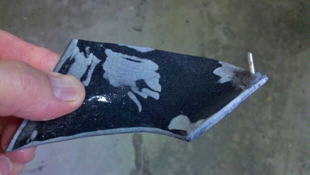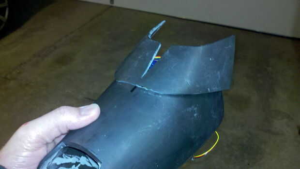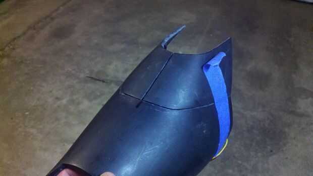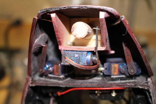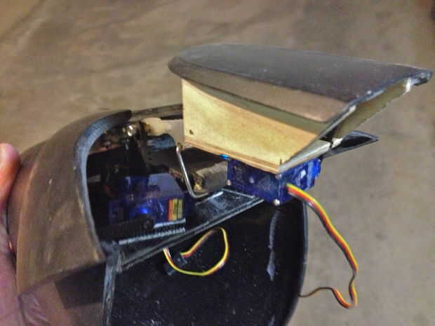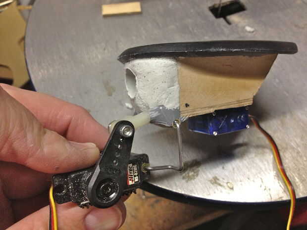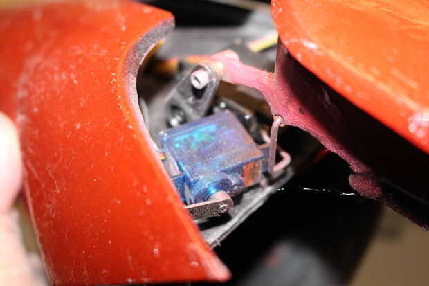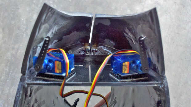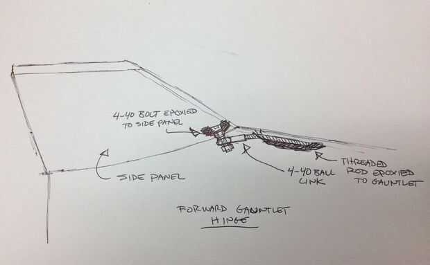Para hacer el compartimiento abertura el guante de fibra de vidrio fue primero cortan en secciones apropiadas y una placa base plástica se ajustaron en la abertura. La placa base ofrece una buena superficie plana para montar los servos. Cada uno de los paneles laterales de corte tiene un tornillo 4-40 que se ajustaron en el interior punto adelante con Propoxy 20. En este tornillo fue instalado un enlace del eslabón giratorio con una varilla que se ajustaron en la parte delantera del guantelete. Esto formó una bisagra de pivote único multidireccional para el frente de cada uno de los paneles laterales.