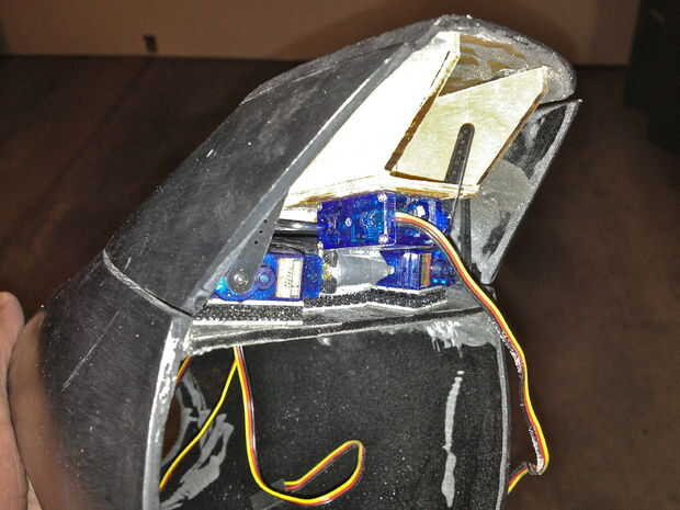 Para hacer los paneles pliegan dos secundario-micro servos tienen sus brazos con una pequeña sección de alambre doblado que se ajustaron a la parte posterior de cada uno de los paneles laterales. Los servos están conectados a la placa base con Velcro de alta resistencia. Como los brazos de servo giran bajan los paneles laterales. Un sistema muy simple y confiable.