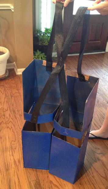 Utilizar una caja grande para formar 2 tubos rectangulares bastante amplio para las piernas y lo suficientemente pequeños para caber para arriba bajo el torso. Cada tubo del rectángulo cerrado dejando la parte superior y parte inferior de la cola abierta. Con el cúter, cortar triángulos en los lados de la rodilla (esto estará por encima de la rodilla del usuario) y un rectángulo de la parte posterior. Doblar la parte delantera del tubo en la abertura creando una rodilla móvil. Ahora utilice su cortador de caja para eliminar las piezas interior y posterior "muslo", dejando una franja mínima de 2" alrededor de la pierna. Tomar una tira más de cartón y pegamento a lo largo de la parte superior de la parte interior delantera de la pierna, colocar las dos piernas (véase la franja sin pintar en la imagen - éste ha arrancado con el uso, pero debe ser todo).