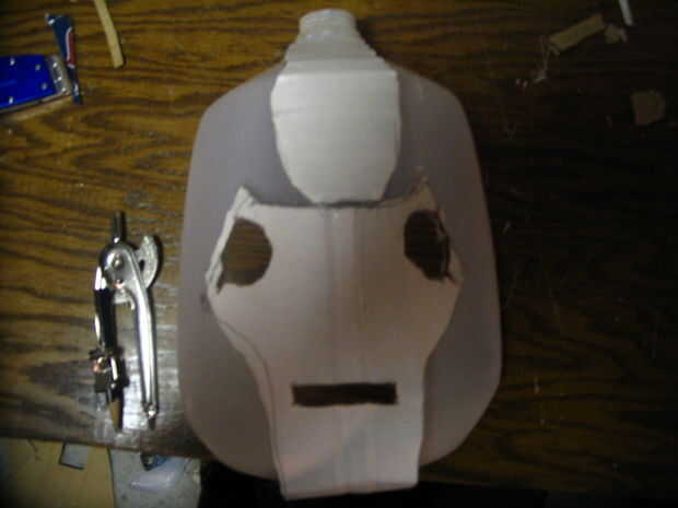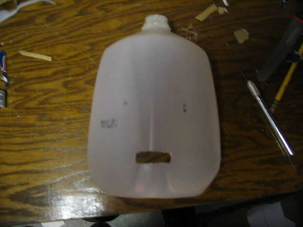 El frente es sólo una jarra de leche con unos trozos de cartón en él.