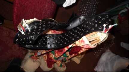2. Ejecute una atadura a través de un ojal en el cinturón de vestir a la tira de la correa que se engancha a la pizza. Hacerlo en ambas caderas para cada pizza.
