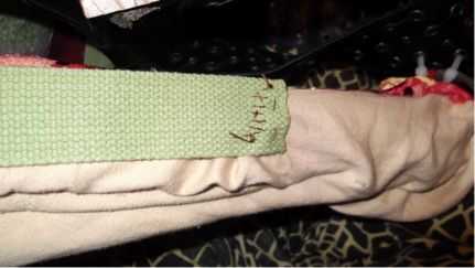 1. Solía el resto de la banda que corte y enganchado los palillos de la yarda anterior para hacer asas y cintas en la parte posterior de cada lado de la pizza. Esto no es necesario, pero encontré que hace mucho más fácil a flare la pizza hacia fuera cuando los llevo.  Usé hilo de tapicería marrón y una aguja. Coloque estas correas en la parte posterior del palillo de la yarda 1 en la pizza de izquierda y derecha.