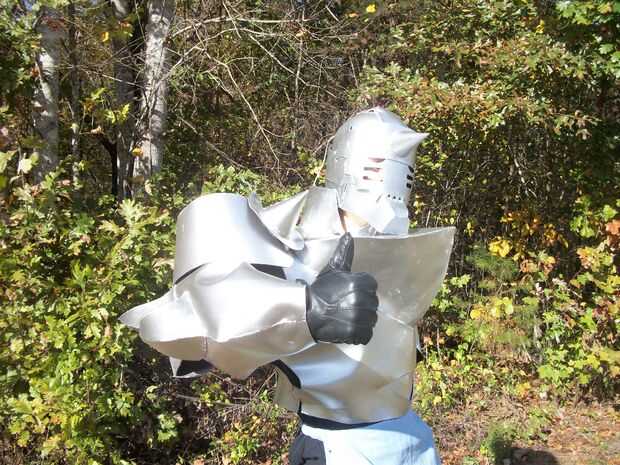El traje me llevó alrededor de cuatro meses para completar el todo en todo. Corte las piezas tomó alrededor de tres meses (trabajando en ello durante mi tiempo libre), y el proceso de sellado/pintura tomó alrededor de un mes. El proceso general fue como sigue: