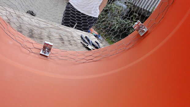 Sujeta en un tornillo de banco y les martilló sobre para crear un bucle a un trozo de cuerda que utilizamos para los tirantes.