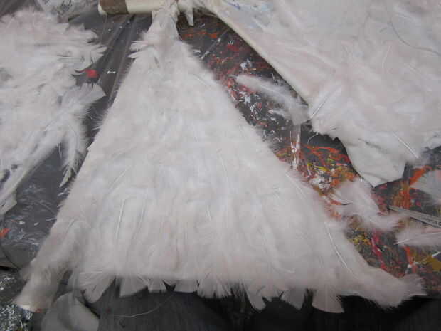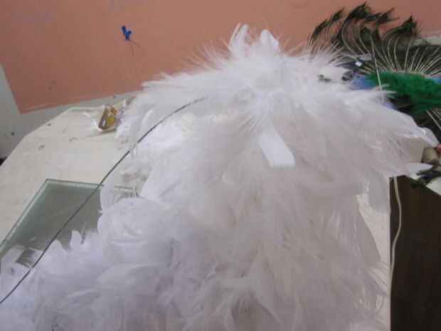 Ahora tenemos que añadir un montón de plumas. Quería las alas para tener una mirada angelical esponjosa, usé plumas de pavo en lugar de largas púas. Eran más pequeños y así tomó más trabajo, pero daban un aspecto más suave.