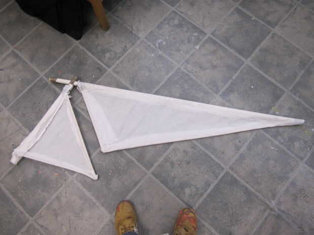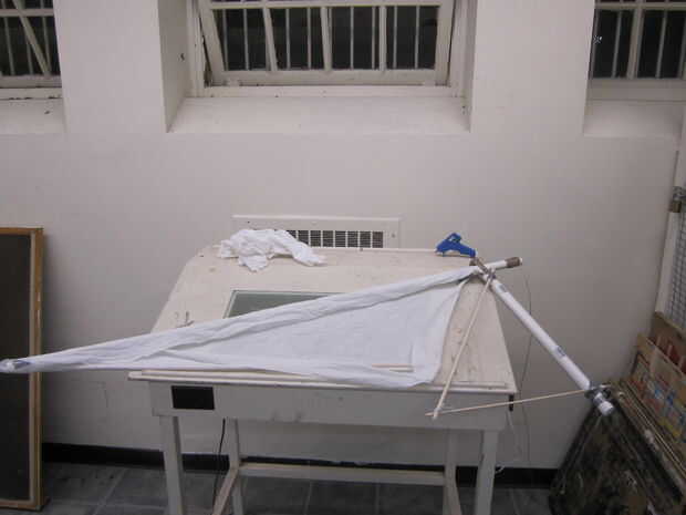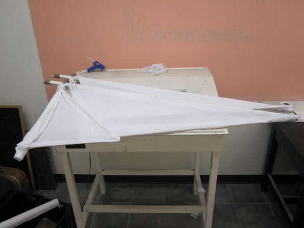 Para empezar, corta a tu tela con las dimensiones adecuadas que cabe sobre los triángulos en el esqueleto de las alas. Saque los tubos cortos y largos (el "ala") del tablero de madera y tubos estructurales (la "mochila"). Caliente pegar a la tela al esqueleto (fotos 1-3).