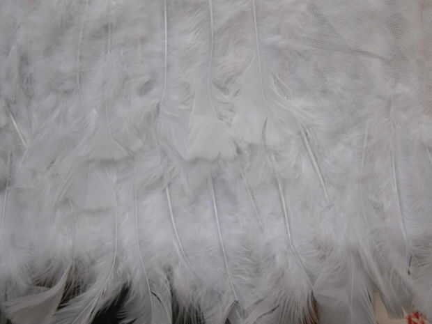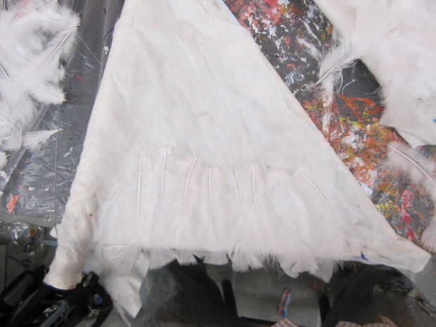 Oriente las plumas en la dirección correcta (en la parte inferior del ala) y pegamento caliente de la canilla a la tela. Iniciar en la parte inferior y suba para que cada capa cubre la parte superior de la anterior (fotos 4 y 5 - es difícil distinguir entre el tejido blanco y plumas, pero hay sucesivas filas de plumas).