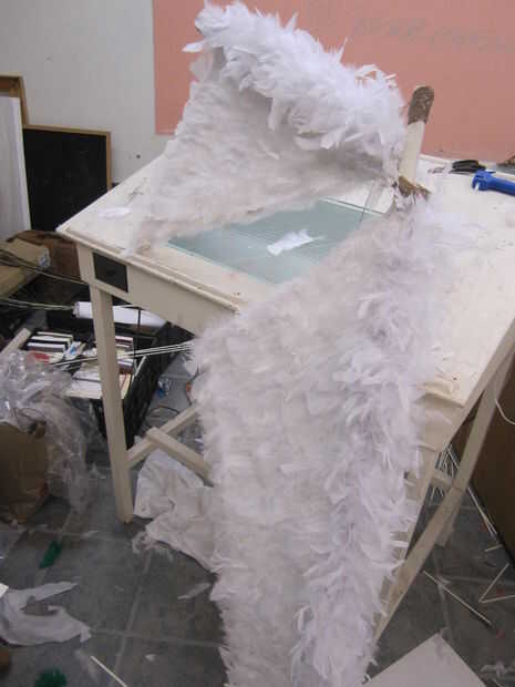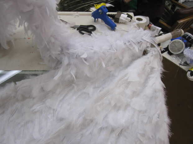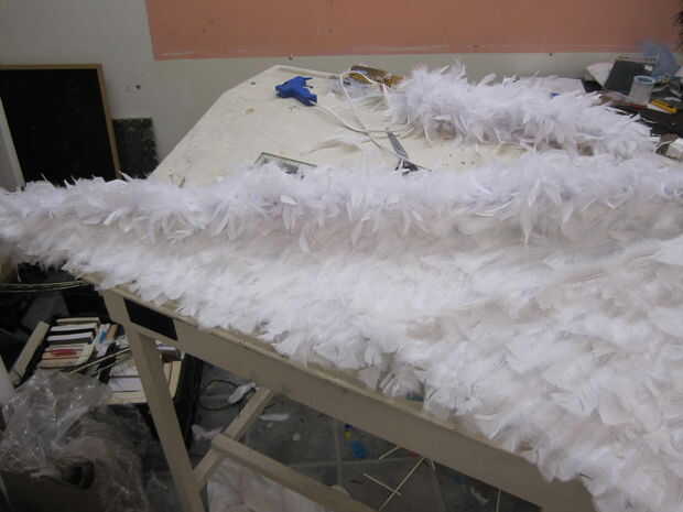Envuelve parte de una boa alrededor de la proyección de la tubería larga (foto 11 - el pavo real plumas en el fondo eran para un amigo, no para este proyecto). Entonces pegué parte de una boa a la espiga de 1 pie conectada a la tubería larga para llenar el espacio entre el ala superior e inferior cuando abrió. Repita con ambas alas (foto 12).