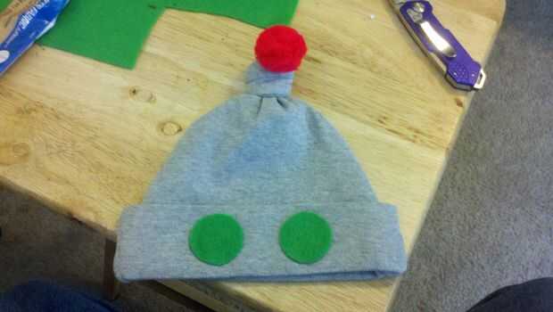 Mi hija no va llevar casco... simplemente no está sucediendo. Así, porque el 31 de octubre es generalmente cuando comienza el tiempo chungo en Vegas que decidí hacer traqueteando cabeza fuera un gorro de punto. He comprado un gorro tejido de las interwebs que empareja los cambios y tenía un pequeño nudo en la parte superior. A continuación, usar algun pegamento de tela y fieltro verde, adjunto unos ojos hasta el borde de la tapa. Finalmente, he añadido una cosa bola de poof rojo a la parte superior. (Debo crédito a empleados de nave almacén para entender lo que quise decir por lo de "bola de poof" cuando pregunta qué pasillo "poof bola cosas" estaban en Michaels. Es muy intuitivo.) Todos juntos, una vez que los materiales fueron recolectados, esto tomó cerca de 1 hora para hacer... Tomar una foto de mi hija cuando ella no estaba llorando o tirando la tapa era la parte más difícil.