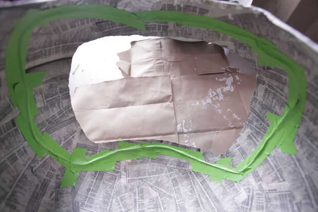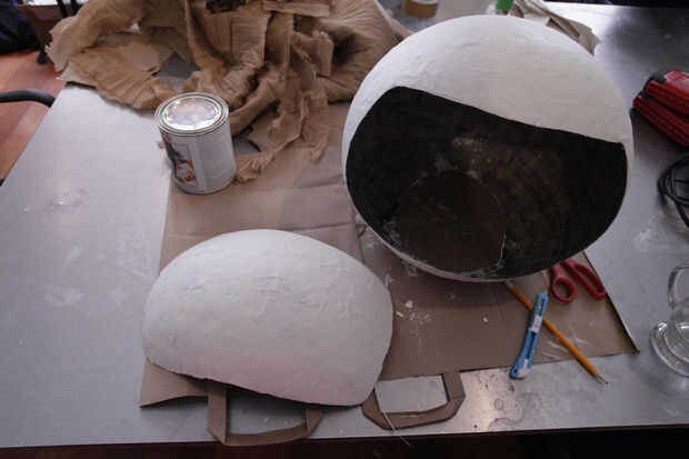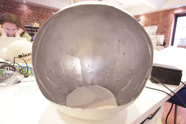 Utilizando un alambre del achique y alguna cinta de enmascarar, había reforzado el borde cortado del casco, para que no bajar en mi cabeza. Entonces roció el interior de la esfera con pintura de aerosol de plata.