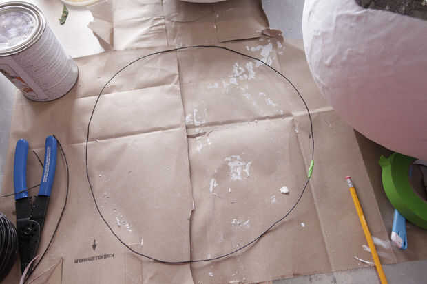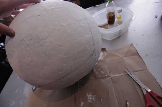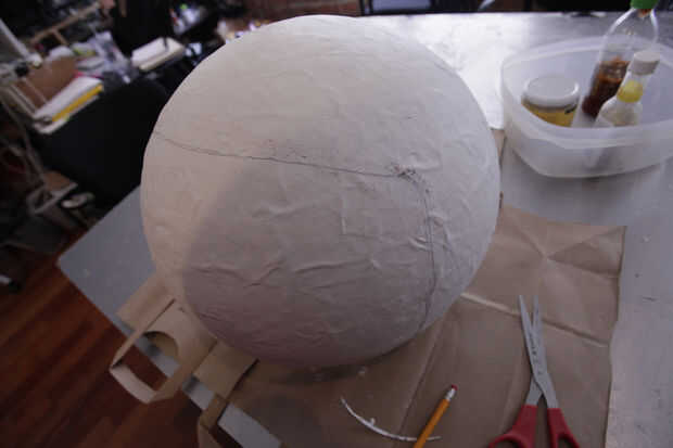 Yo entonces trazado forma básica alrededor de la esfera que sería la apertura del casco. Utilizando la hoja de afeitar, corte la abertura hacia fuera.