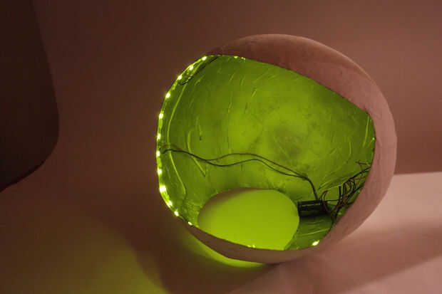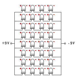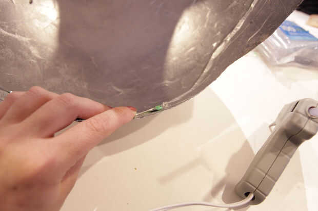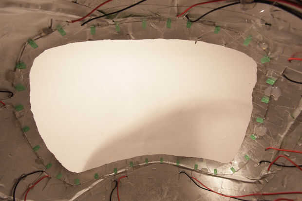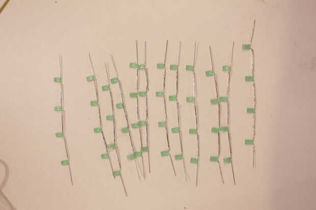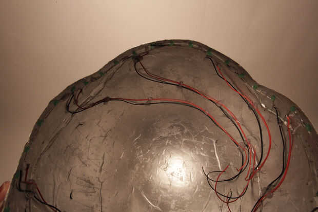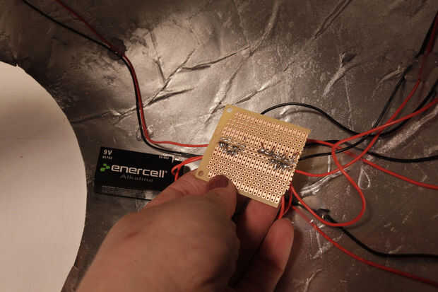 Yo soldado 4 LEDs a unos de otros, en preparación para hacer la serie paralelo que puede ser alimentada por una batería de 9V. A continuación, encolar la serie LED y funcionó los cables todo el casco a un PCB.