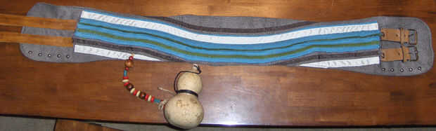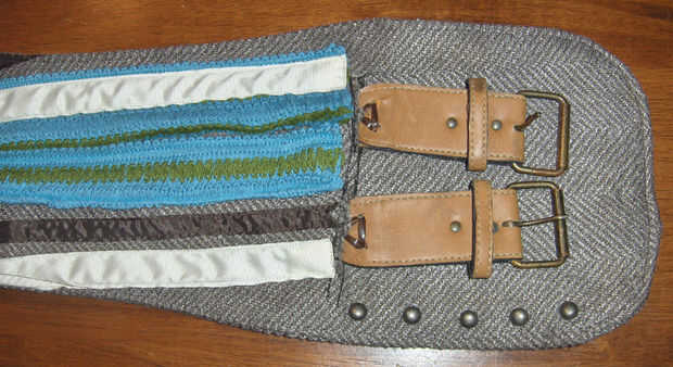 El cinturón era muy complicado hacer utiliza dos capas de la tapicería y sólo cosido a los lados para conseal las correas de cuero había hecho para la adición de cuero tiras. Tuve algún cordón que era algo similar al patrón que está en el cinturón. La mejor manera de explicarlo es que una pieza superior (uno con la cinta coloreada en él) y una pieza de tapicería (aquel que va en contra usted. Para hacer la correa me mide mi cintura y había añadido 10" para un compromiso. en la pieza inferior se necesitan por lo menos 3 presillas para sujetar las correas en posición. Para la pieza superior necesita poner la cinta en una onda patrón y coser en su lugar. Cuando se cose las dos piezas juntas que solo desea coser alrededor del exterior tan las correas pueden ejecutar a través del medio y a través de las presillas internas ahora. Lo mejor ahora es coser justo en frente de donde se detiene el cordón y cortar el material inmediatamente después de la costura pero antes las cintas para deslizar las correas entre las capas.