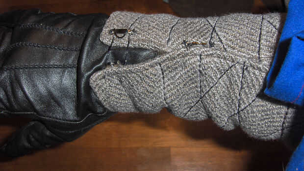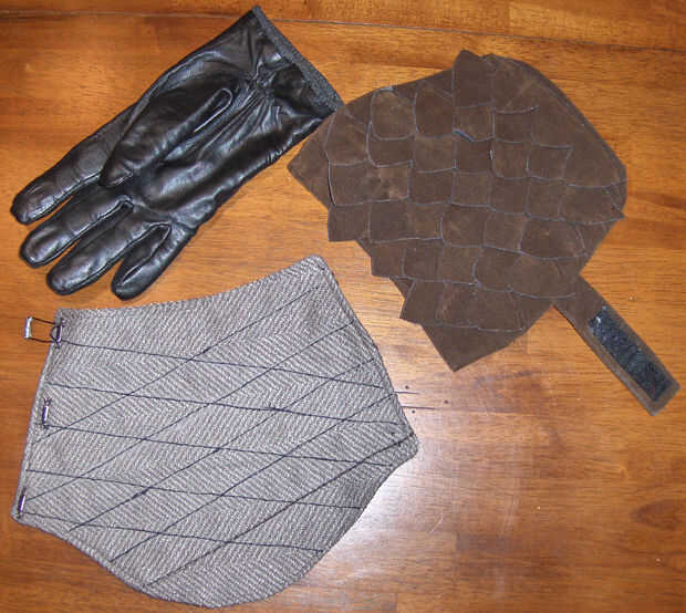 Para el bracer hay tres partes. La parte gris es sólo lo que parece ser un abrigo en Aurons muñeca se fue del mismo material que el cinturón sólo tiene líneas cosidas en él. Para el marrón protector que está hecho de gamuza tiene tela que se corta como filas de escalas y niveles. Una tira de velcro se utiliza para mantener la guardia en su lugar sobre la envoltura. El wrap utiliza ojo y ganchos para mantenerlo en su lugar, el guante es empujada bajo el abrigo y mantener apretado. El es solo un guante de cuero negro regular.