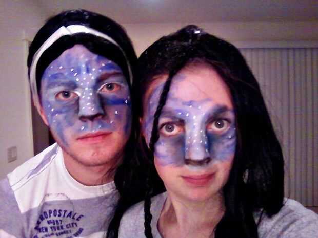 cubrir el rostro y cuello con la pintura azul claro. llegar tan cerca de los ojos y labios como sea posible. No olvide repasar las cejas.