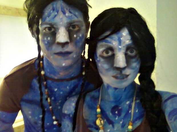 cubrir el cuerpo entero en la pintura de cuerpo azul. Se necesita alguien que le ayude con esto.