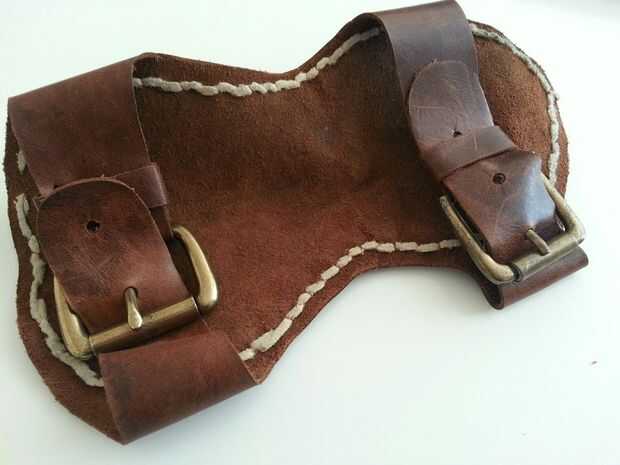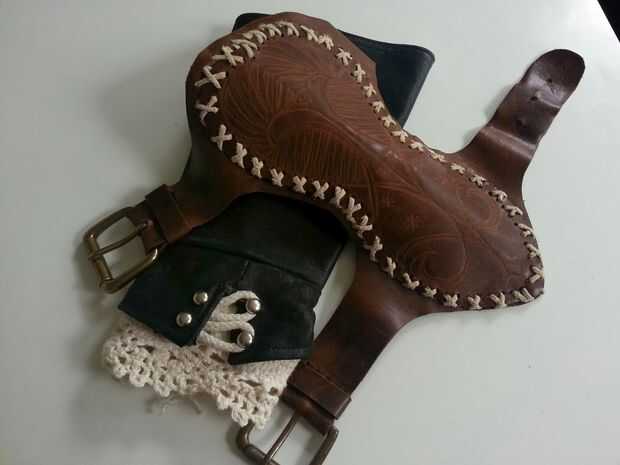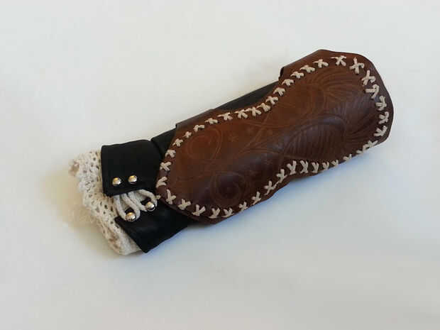 Para ello, cortar la forma del cuero de chatarra y luego utilizó un nuevo pedazo de cuero pesado para el diseño en forma de pera. Quería hacer de cuero real de herramientas, pero con los vecinos de abajo, horas de martilleo habría traído algunas principales ire. La engañé mojando el cuero un poco y usando un pequeño destornillador cabeza plana y un punzón para comprimir la piel a mano y raspar de la capa superior lejos. Bastante bueno. Luego utiliza una máquina de agujero de cuero y cosida la pieza gruesa en el bracer, agregada hebillas de la correa y listo.