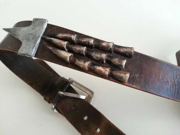 La correa del cuerpo cruzada con los dardos de golpe (sí, eso es lo que los que se suponen que son) es sólo un cinturón muy largo marrón con los bits superglued en. He creado las piezas de plástico en una manera similar a los símbolos de asesino que he mencionado más arriba, pero en vez de un molde de silicona, apenas utilizado arcilla polimérica. Mucho más barato y reutilizable, pero menos preciso. Luego pintura y aleta.