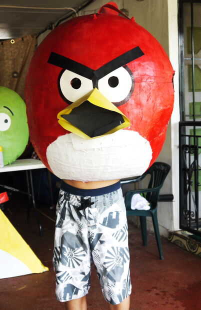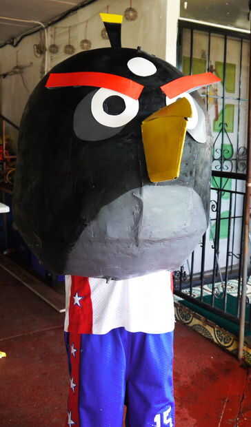 Después de pegar todas las piezas: pelo, pico y ojos, hicimos un último toque para arriba con nuestras pinturas, y aquí está! Nuestro traje de Angry Birds!