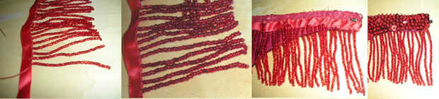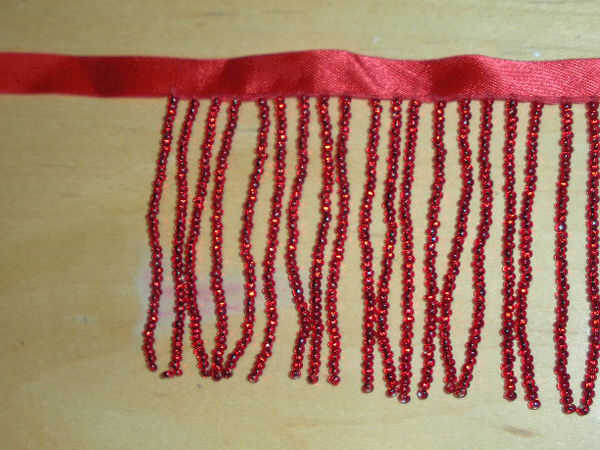 Primero se corta la longitud de cinta que necesita para el elemento de la franja y deja un poco extra para doblar para hacer un borde elegante. Luego marque la longitud con una regla y poner pequeños puntos con un rotulador de color claro en el borde de un lado de la cinta, estos son los puntos donde tienes que añadir las hebras de perlas, así que usted sabe en el extremo de que los filamentos con cuentas terminará uniformemente (o se puede ajustar para adaptarse antes de empezar).