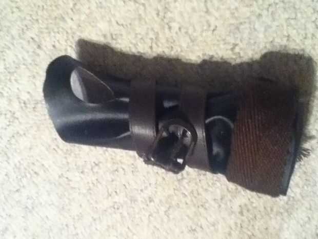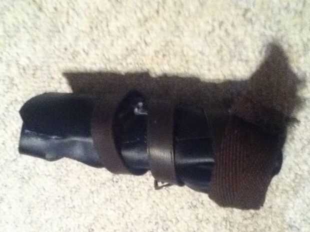 Para hacer el guante, todo lo que necesitas hacer es recortar un rectángulo de vinilo negro lo suficientemente grande como para envolver alrededor de su brazo de la muñeca, hasta aproximadamente mediados de-antebrazo. Una vez que ha hecho seguro de esto, puede pegar el vinilo, en un cilindro. Una vez hecho esto, ponen hasta que cubra la mitad de su mano y haga una marca donde el pulgar entonces es cortar un agujero para el pulgar.