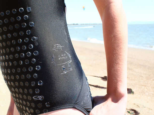 El secreto es una fina capa de masilla de silicón a través de una galería de símbolos. La silicona es elástica y puede doblar con el movimiento de un traje de baño, estancia durable y firmemente en su lugar. Este proyecto explora el concepto de la aplicación flexible de silicona a un traje de baño. Los resultados fueron un éxito, pero tuvo algún ensayo y error.