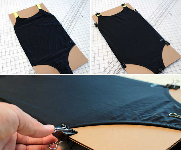 Antes de aplicar la plantilla el traje de baño debe fijarse a una superficie plana con el fin de realizar una transferencia limpia de la plantilla. Una sección de cartón fue cortar resbaló dentro el traje de baño y suavemente estirada plano y liso.