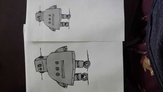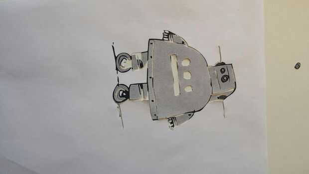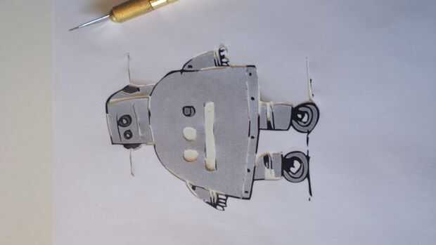 Imprimir hacia fuera una imagen del robot de instructables y tallar un poco del negro. Si se puede a mano alzada el robot o no quieren usarlo entonces omitir este paso. Asegúrese de que usted no cortar demasiado para que los pedazos caigan. Cortar las cosas que pensé que podría utilizar como una guía y a la izquierda en algunos el negro como un recordatorio en cuanto a donde las líneas se pretenden ir