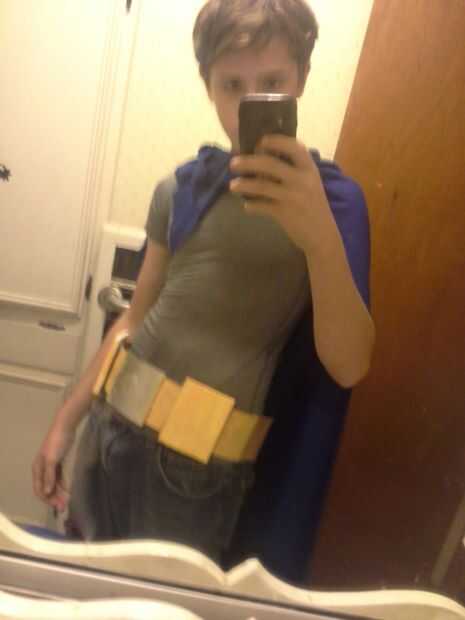 Hey voy a mostrar un traje de batman cojo y dorky podría como tu hijo.materialescinturón de utilidad de Walmart 6.00$Batman camiseta 9.00$ a blancouna manta negra o azulahora lucha contra el crimen como el cruzado de la capa real