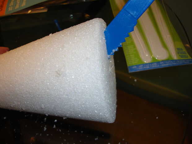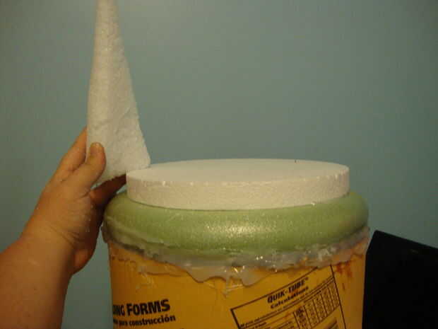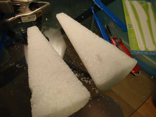 Crear orejas de Lego Batman compró un cono de espuma de poliestireno y había aserrado en la mitad. Me ha pasado que algunas herramientas para hacer cosas locas con espuma de poliestireno que utiliza los pero un cuchillo de la caja, cuchillo, cuchillo de mantequilla, cuchillo de la manía o Batman debe hacerlo. Una vez cortadas por la mitad en la forma de las orejas para ser más Lego Batman como.