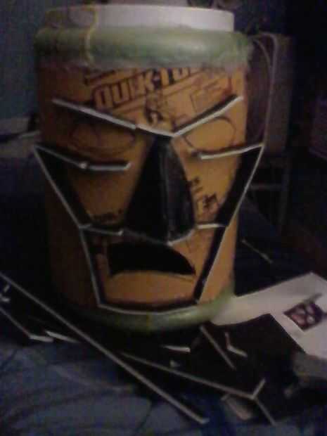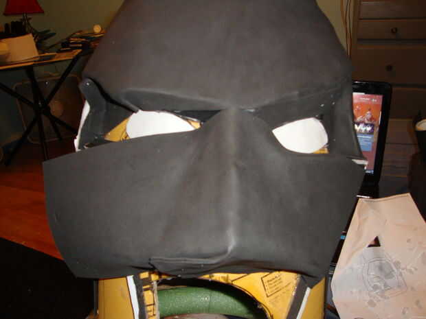 Uno está contento con la construcción inicial, que puede empezar a cubrir la superficie con las hojas de espuma negra 12 X 18. Caliente pegado en su lugar. Quería las hojas debido a la elasticidad, la textura y es fácil de agarrar en el camino. Puedes pintar la cabeza, o utilice un fieltro o algún tipo de tela en su lugar. Estoy buscando en grandes hojas de espuma para recuperar la cabeza, me gusta el look simplemente no les gusta las costuras.