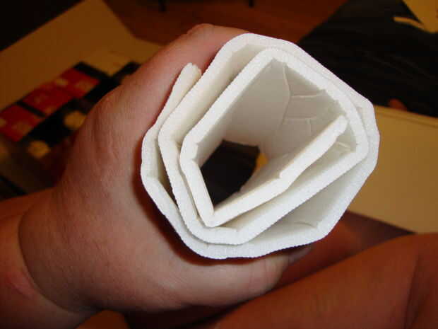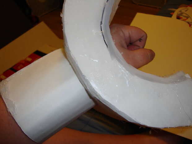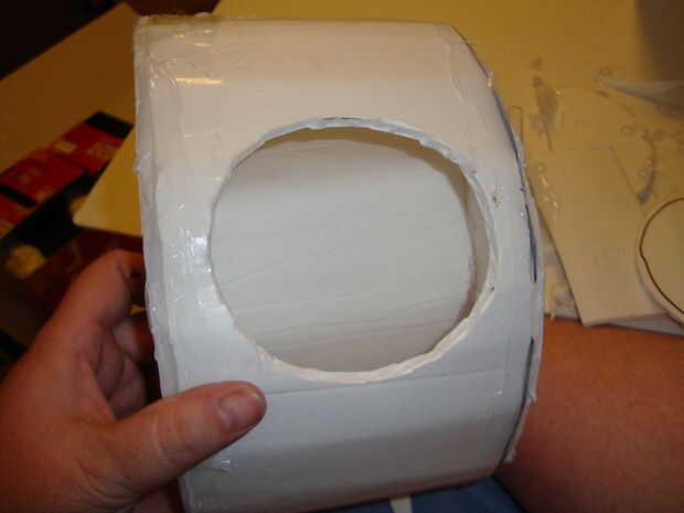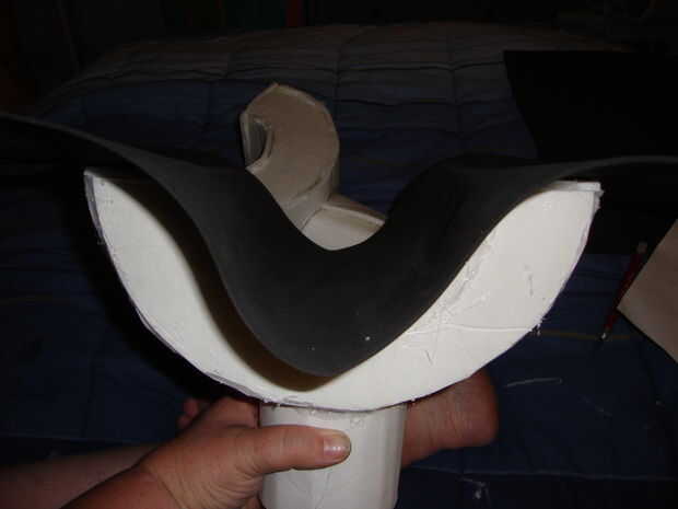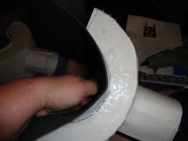 Una característica muy de Lego es sus manos C. Para crear ese look utiliza espuma, dibujó dos círculos y recorto. Una vez cortadas dividir el círculo en medio y creó el C. haciendo incluso espaciado alrededor del exterior del círculo hasta la forma de C fue incluso. Entonces dibujaba tiras de la anchura de la C y caliente había pegado en su lugar. Para hacer la muñeca, he rizado el núcleo de espuma, cortado a la medida e inserta en el dorso de la mano. Originalmente pensé que tendría un orificio de mano por lo que pude pegar una mano enguantada de la C para sostener cosas, nixed la idea y cubiertos todo en espuma negra. También amplié la espuma negro para arriba así que afectaría cerca de mi codo, ayudando a dar ese plástico Lego tubo brazo.