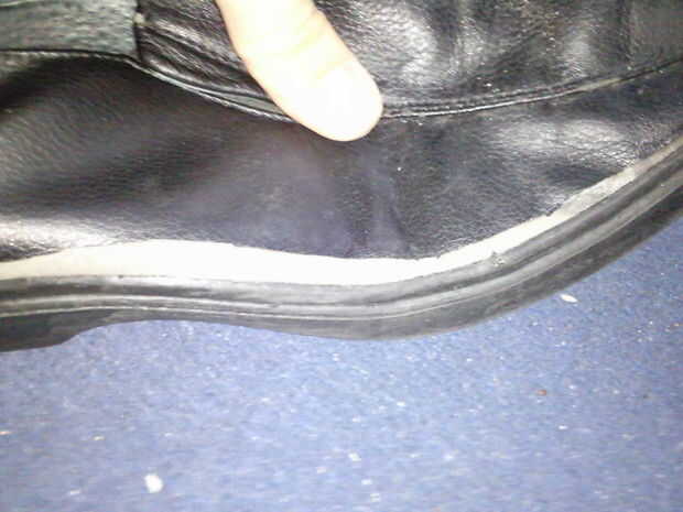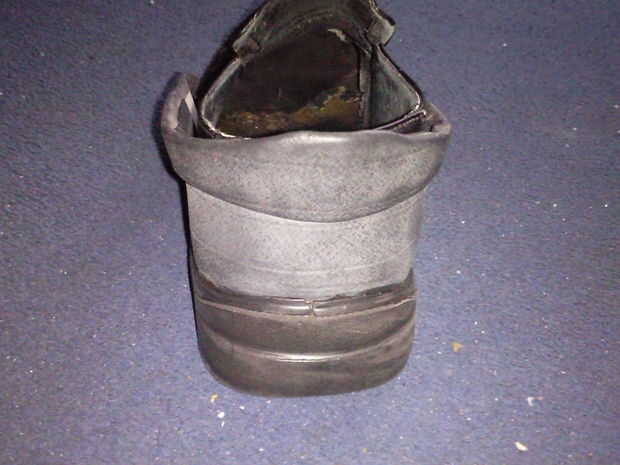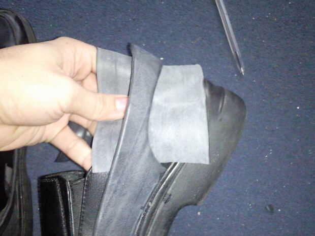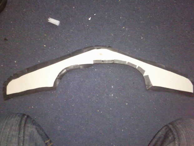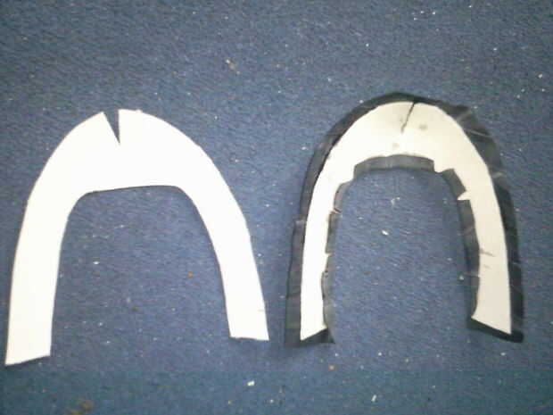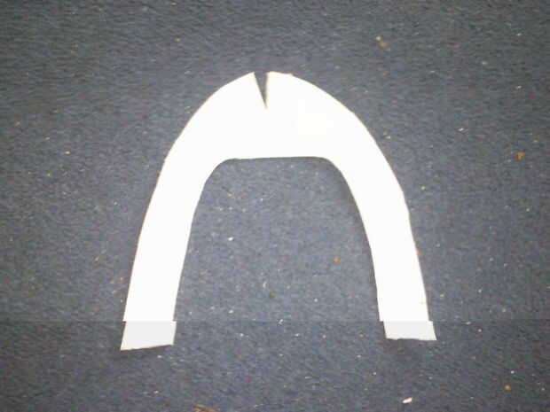 Usando las tiras del ancho de la llanta medida la longitud desde la sanación de su pie en la parte posterior de la rodilla, necesita sobre 5 tiras esta longitud. Poner juntos que dos de las tiras y luego desde la parte superior cortan en ángulos de ambos lados para que usted termina con sobre una anchura de 2,5 pulgadas en un extremo y 6 pulgadas en el extremo superior. colocar todas las piezas restantes usando la misma técnica usada para hacer las piezas del brazo (pequeñas tiras).