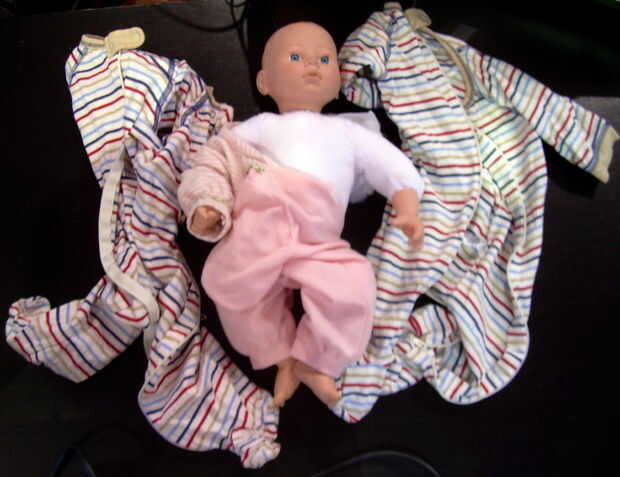 Una muñeca de tamaño similar puede ser útil para dimensionar el traje para su bebé de brazos de 3.  Usaremos uno de sus brazos para burlarse de la vestimenta, aunque por supuesto lo Sustituímos real tercer brazo de Corvidae cuando lleva el traje.
