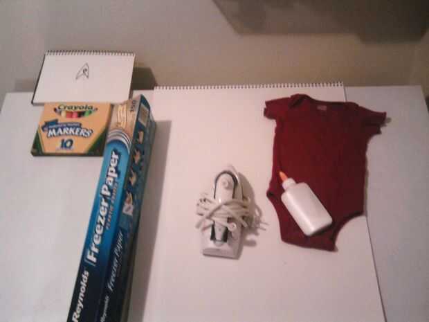 Un jersey de bebé (mono, mono, enredadera, etc..) En un color sólido como un uniforme de star trek. El símbolo de la estrella emigra Papel de congelador Pegamento Un hierro Un bebé (no fotografiado)
