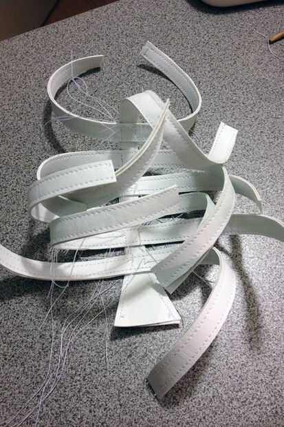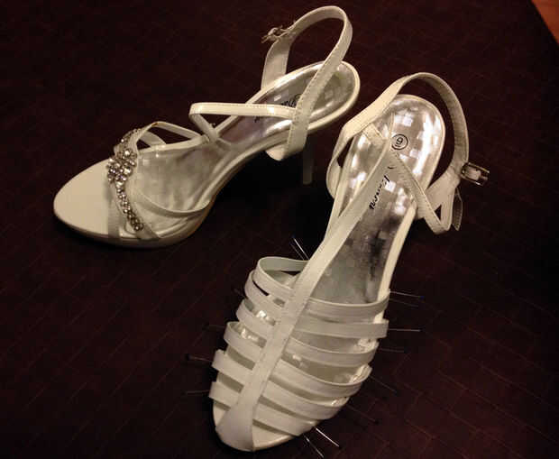 Obtener cómodos tacones blanco (baratos) con (al menos) un tobillo y abierta del dedo del pie. Quitar que un unnessceray correas y bling. Tomar su cuero blanco/piel artificial y cortar 12 tiras de .75cm ancho y 2 tiras que tienen una mayor 'triángulo base inicial' (estas serán las correas del t). Espacio 6 de las tiras de .75cm aparte de uno otro y cosa una correa por la mitad de ellos. Repita esto con las piezas restantes.