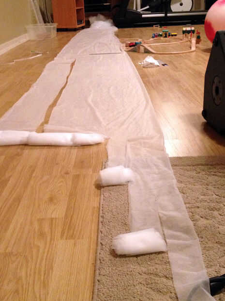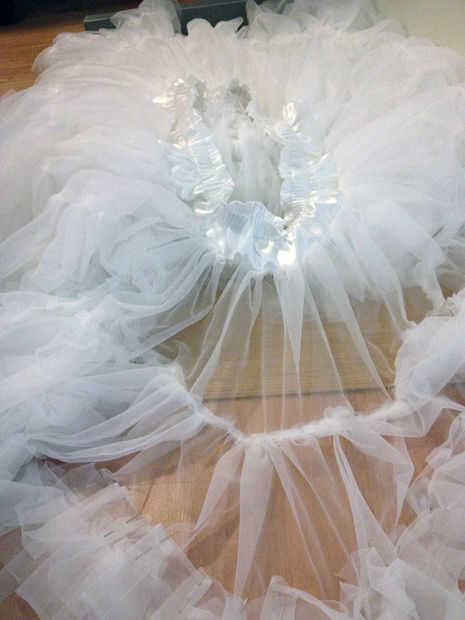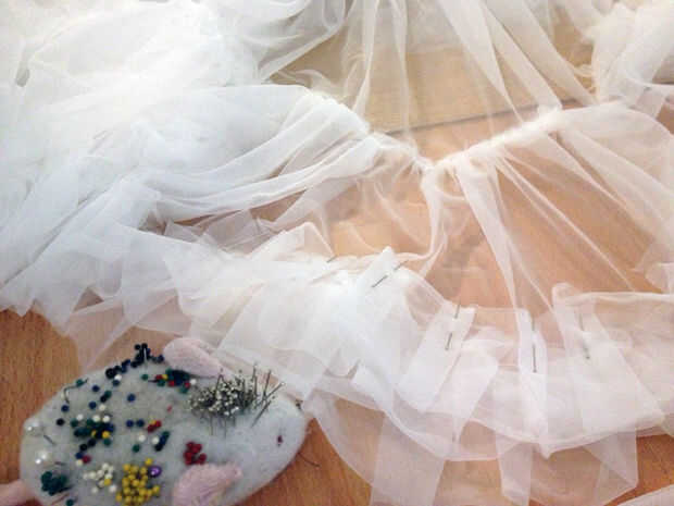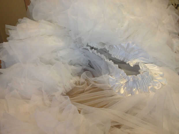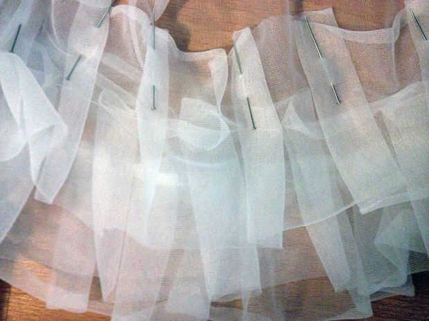 Una vez terminado el pettiskirt, iniciar el proceso largo, aburrido, succión de alma de mano-plegado-y-alfileres 3" gran súper tiras largas a la capa externa de tu falda. Que va a hacer 14 de ellas en la falda entera, todas ellas ligeramente superpuestos.