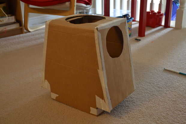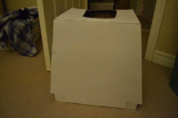 Sabía pintar cartón marrón no era un buen punto de partida, así que decidí cubrirlo todo en cartulina blanca. Me dio un gran limpiador, más fácil de superficie de la pintura. Utiliza pegamento del gorila y una pistola de pegamento para pegar la cartulina sobre el cartón y había pegado con cinta de enmascarar hasta que el pegamento seca.